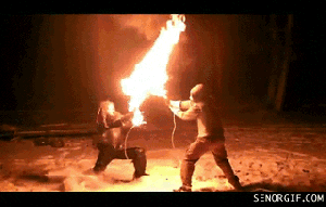 If he keeps charging at his enemy like that he's going to be skewered. [Never mind the part where their swords are on fire, he's going to be critical about their form.]